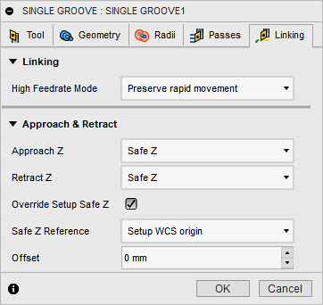Використовується для визначення положення інструменту на початку та в кінці операції. За замовчуванням встановлено положення відносно SafeZ, як визначено в налаштуваннях завдання. Ви можете перевизначити це, щоб посилатися на WCS, лицьову сторону або задню частину.