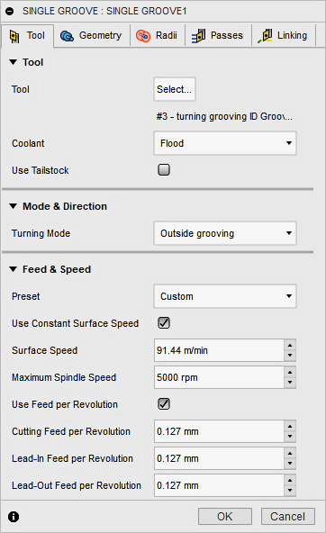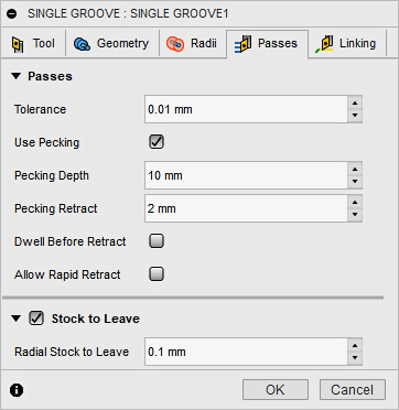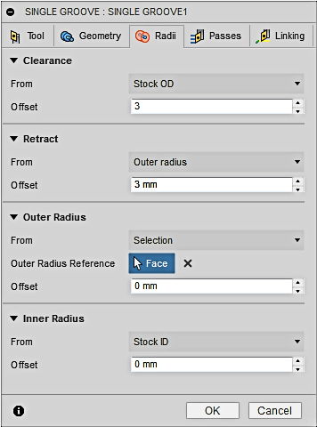 - Наскрізний проріз — кінчик інструмента проходить за вибрану радіальну відстань у негативному радіальному напрямку для зовнішніх канавок і в позитивному радіальному напрямку для внутрішніх канавок. Важливо: вибір між внутрішніми та зовнішніми канавками відображається на вкладці Інструмент , а не на вкладці Геометрія .